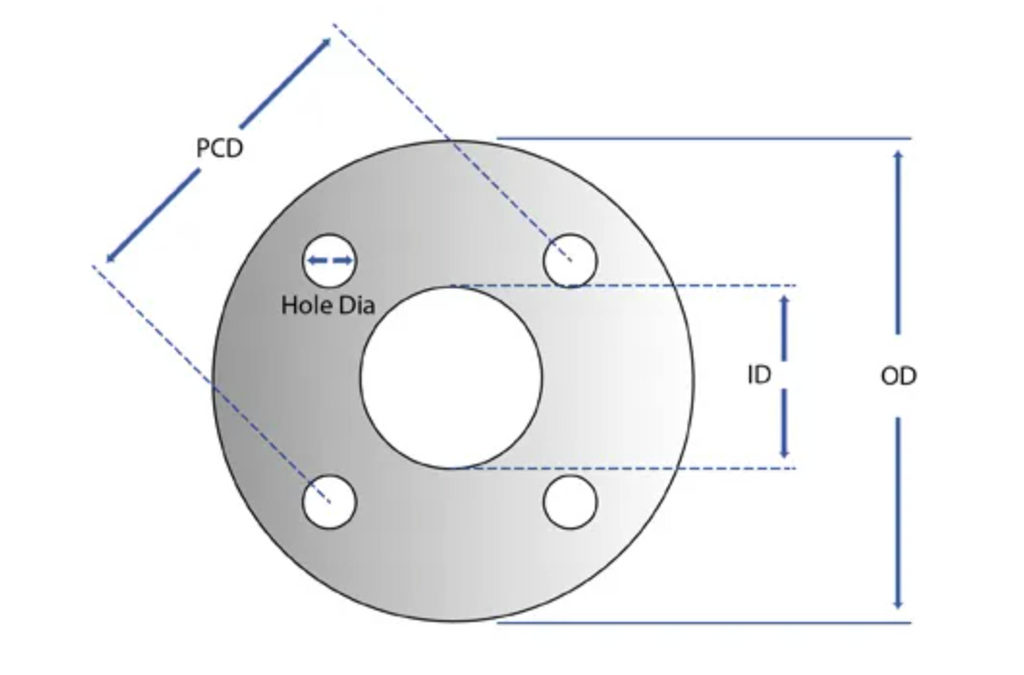 The number and diameter of holes together with the PCD determines the flange size and pattern. The PCD (Pitch Circle Diameter) is the measurement from the centre of one bolt hole, across the centre of the flange, to the centre of the opposite hole.